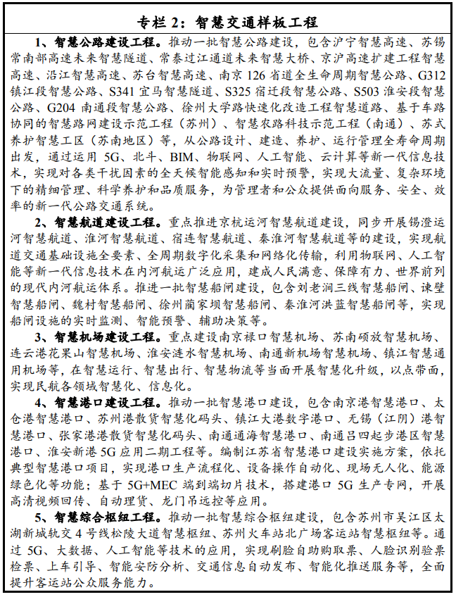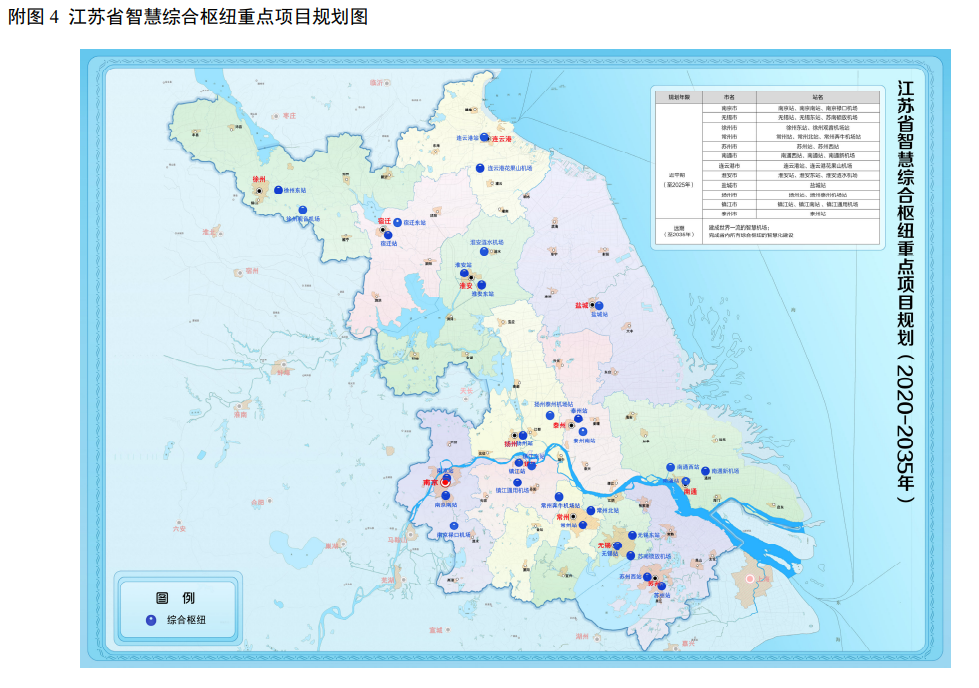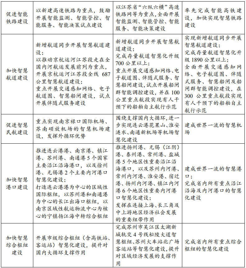 加快推进智慧综合枢纽示范工程建设。依托江阴站综合客运枢纽、沪苏湖铁路苏州南站、北沿江高铁南京北站、南通站、苏州市吴江区太湖新城轨交4号线松陵大道智慧枢纽、苏州火车站北广场客运站等新建和存量综合客运枢纽,开展智能化系统建设,实现智慧服务和智慧管理。