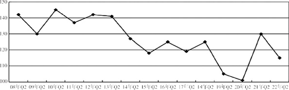 2022年二季度,外贸出口景气指数为100,与上季度持平,与去年同期相比下降了15个百分点,位于"微景气区间"(见图16)。其中,有32%的调查企业国外订单有了新的增长,比上季度上升了5个百分点;有36%的企业反映销售"持平",比上季度下降了10个百分点;有32%的企业反映"下降",比上季度上升了5个百分点。